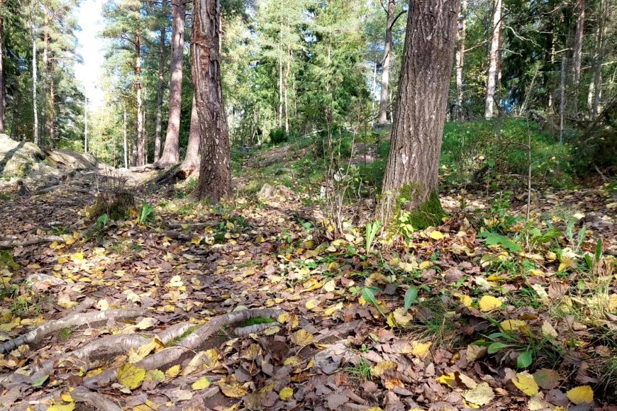 Kuva Espoon Puolarrmaarin frisbeegolfradalta syyskuun loppupuolelta 2023. Maastossa näkyy jo syksyn värejä. Kuva: KivaaTekemista.fi