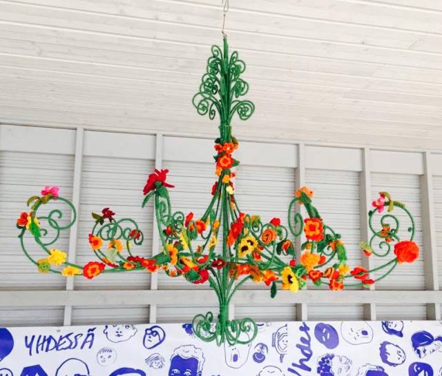 Kuvassa Riikka-Piikan Neulekahvilan Suomi 100 -projekti: Katonrajan Kaunokainen. Kattokruunun on määrä valmistua lopullisesti 6.12.2017. ”Kattokruunusta piti tulla sellainen pieni pilpare, mutta se kasvoikin innon edetessä yli metriseksi kanttiinsa eli se ei enää mahdu edes henkilöautoon!”