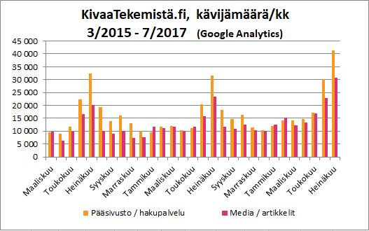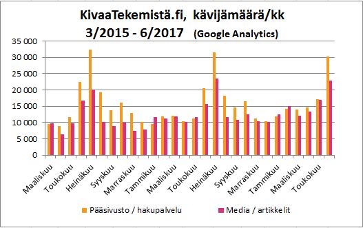 KivaaTekemistä.fi -sivuston kävijämäärä huhtikuussa 2017 yllätti iloisesti. Hakupalvelussa ja artikkeleitamme lukemassa vieraili nyt 28 100 kävijää, kun vuodentakainen vastaava määrä oli 20 600. Tämä oli paras huhtikuu ja kävijämäärän kasvu viime vuodesta oli huikea 36 prosenttia! Kiitos lukijat.