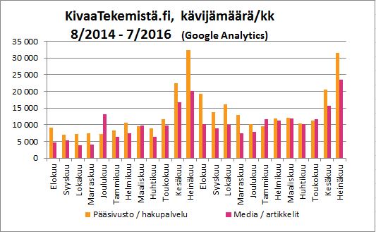 Tämän lisäksi Kivaa Tekemistä -artikkeleita luetaan vilkkaasti ja palvelumme kokonaiskävijämäärä (hakupalvelu + artikkelit) viim. 31 päivän ajalta on 48 000!